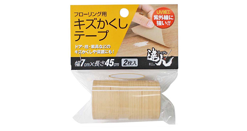 こちらもかなりシンプルな疵隠し方法です。疵のあるところにペタッとシートを貼り付けるだけ。それだけでいいんです。テープ自体がフローリングのような模様になっているので、見た目に違和感がありません。時間をかけずにさっと修繕したいという人にとっては、うってつけのやり方でしょう。