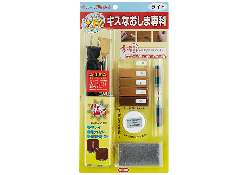 かなり深い疵には、ハウスボックスの『キズなおしま専科ライト』がおすすめです。電熱のコテや木目のペンなど本格的なアイテムが揃っています。クレヨンタイプに比べると、耐久性、耐熱性という面でも勝ります。電熱のコテで専用のスティックをつかすことにより、疵や凹みを直します。初心者よりも上級者向けに思えるかもしれませんが、コテの扱い方などはそれほど難しくなく、慣れればそれほど時間をかけずに、床を美しい状態へと再現することができます。
